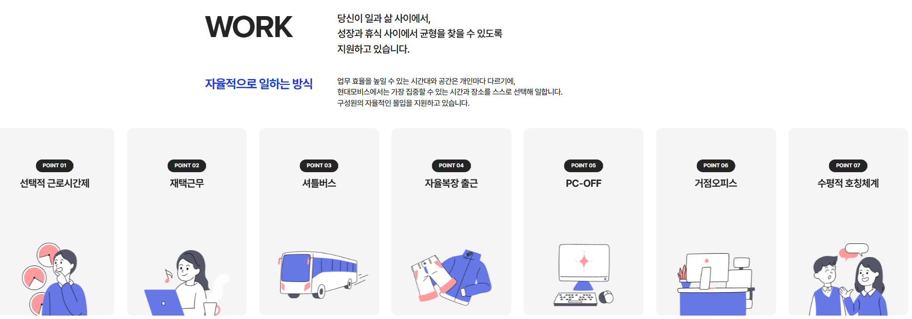 생산직은 전국 주요 공장에서 근무하며, 통근버스, 기숙사 등 복지시설이 마련돼 있습니다. 그룹 계열 구조 내에서는 현대차–모비스–기아의 삼각 구조에서 ‘부품 공급과 미래 기술 개발’이라는 중추적인 역할을 수행하고 있으며, 순환출자 구조 개선 이후에는 독립적인 기업 가치도 점차 강화되고 있습니다. 또한 사내복지로는 선택적 복지 포인트, 직무 교육 프로그램, 주택자금 대출, 건강검진 지원 등 다양한 제도가 운영되고 있으며, 최근에는 사내벤처 및 조직문화 혁신 프로젝트도 확대하고 있습니다.