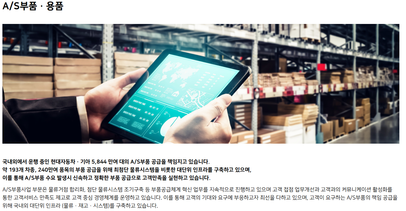 - AS부품 부문: 차량 유지보수를 위한 250만 종 이상의 부품 공급 (글로벌 부품망 운영) 특히 자율주행·친환경차 기술 개발에 적극적이며, 현대차그룹의 자율주행 플랫폼과 통합 제어 기술 개발에서 핵심 역할을 수행 중입니다. 국내 최초의 모듈화 생산 체계를 갖췄고, 현대·기아차의 생산라인에 최적화된 조립시스템을 운영 중입니다.